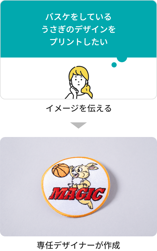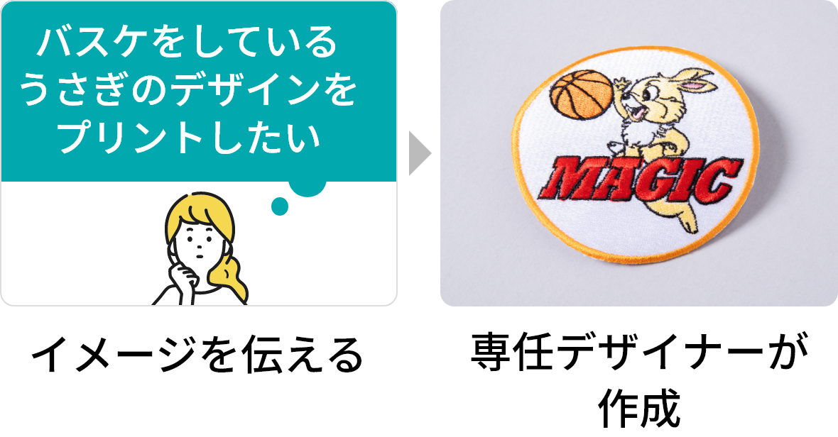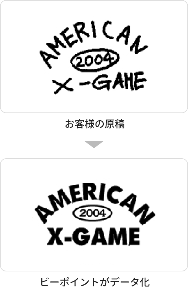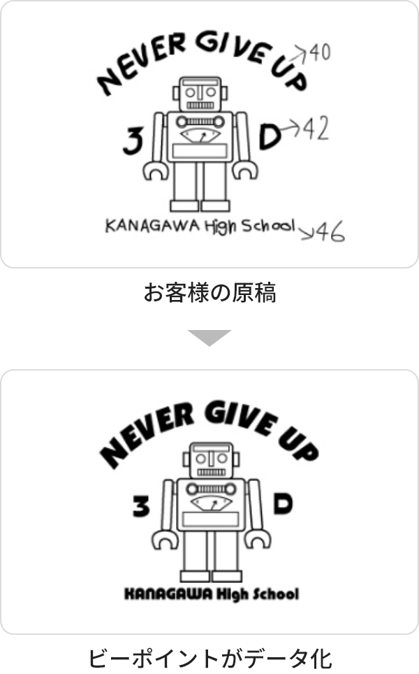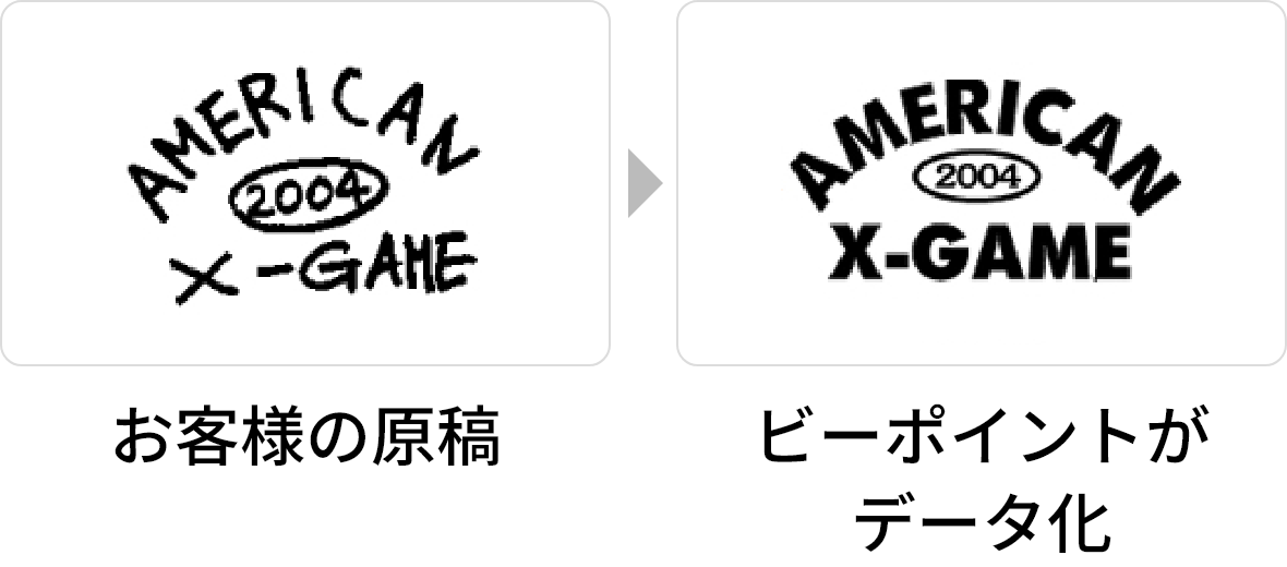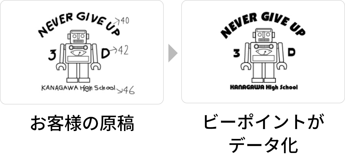手描きで「こんな感じでお願いします」でもOKです。文字はフォントリストから選んでいただきます。デザインツールが無い方でも安心して、ご依頼いただけます。フリー素材もご用意しているので、お気軽にご相談下さい。ビーポイントにてデザインデータを作成してから、FAXもしくはメールにて確認をしていただき、プリントという流れになります。