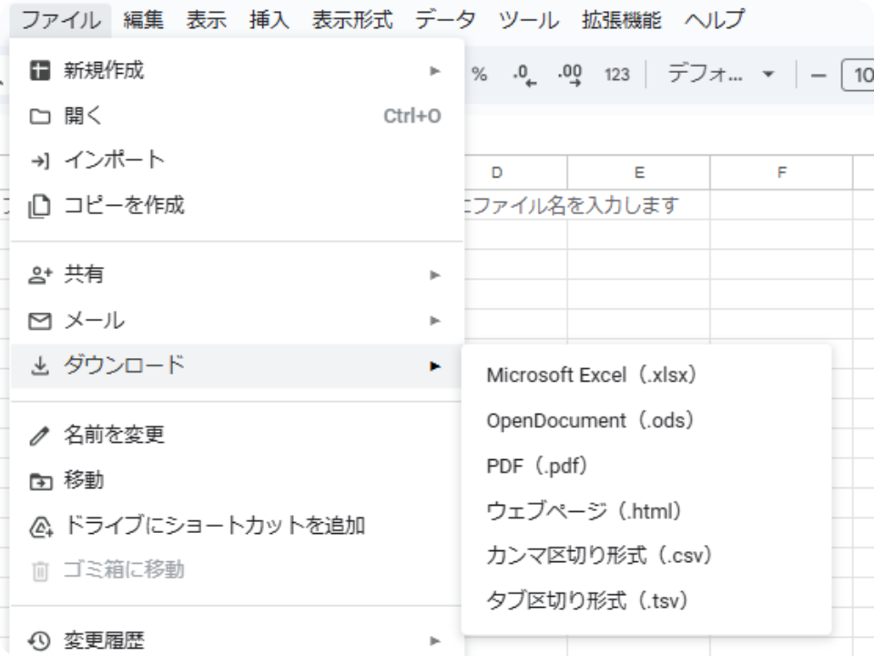 - メニューバー「ファイル」→「エクスポート」又は「ダウンロード」→「PDF/XPSドキュメントの作成」選択